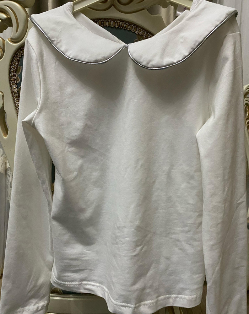 Дизайн модели дополнен кантом с серебряным люрексом по краю воротника, который придаёт лёгкий блеск и делает блузку более нарядной. Классический воротник сохраняет строгий стиль, соответствующий школьному дресс-коду, а застёжка на пуговицу сзади облегчает надевание и добавляет аккуратный декоративный элемент в спинке изделия.
